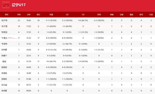 这场比赛被上调辽宁男篮一队的17岁小将于善元继续先发登场,但他仅仅打了15分钟就打卡下班,全场比赛8中8,罚球2中1,拿到17分6篮板1助攻1抢断2盖帽,命中率100%,于善元首次以100%命中率提前打卡下班。