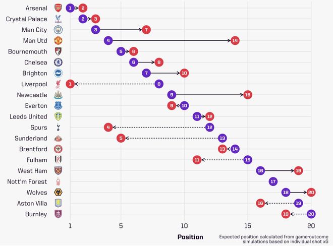 雷速体育10月1日讯 今日,国外知名数据机构公布了一项英超联赛前六轮预期积分排名的数据结论,其中目前位列榜首的利物浦期望排名仅位列第八,而排名第二的阿森纳期望排名是英超第一,实际排名第四的热刺预期排名仅为英超第12。